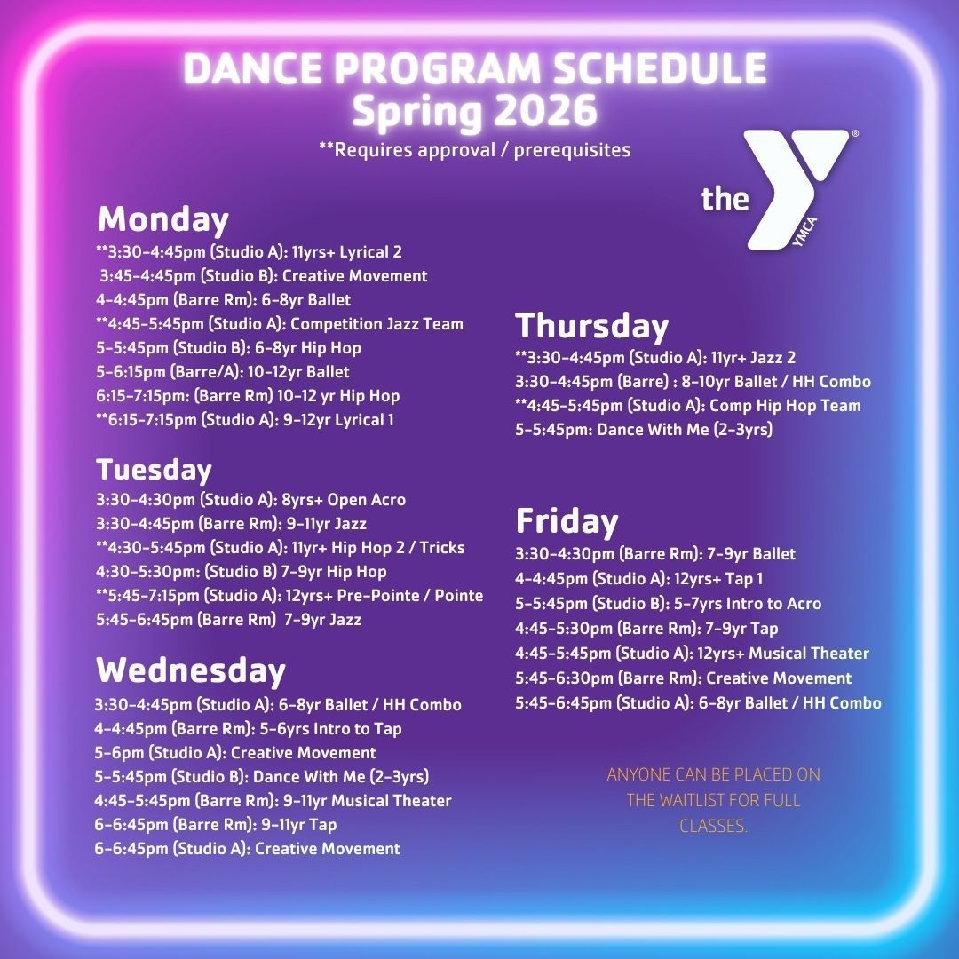 New to the YMCA in 2024, dance for youth ages 2 and up. Ignite your passion for dance with our diverse dance program! Our youth dance program offers introduction classes like Dance with Me (parent attendance required) and Creative Movement plus acro, tap, ballet, jazz, and hip hop that provide a foundation for budding dancers.