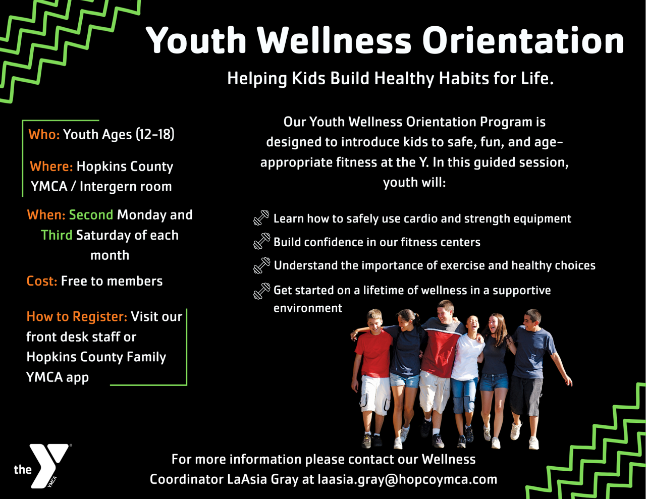 The Youth Wellness Orientation will introduce your child to the Wellness Center and provide info on how the YMCA fits into their goals of becoming a healthier person. Youth are required to attend one 1 hour class. Classes will include both classroom and Wellness Center portions. Upon completion, participants will receive a wristband that will allow the 12-14 age range to use the Wellness Center independently(written doctors statement is still required). Participants must be the required age at time of registration. This free class is an added benefit for youth members who are interested in learning how to safety and effectively use the Wellness Center to improve their physical wellness. For more information contact LaAsia Gray, Wellness Coordinator, laasia.gray@hopcoymca.com or (270) 821-9622.